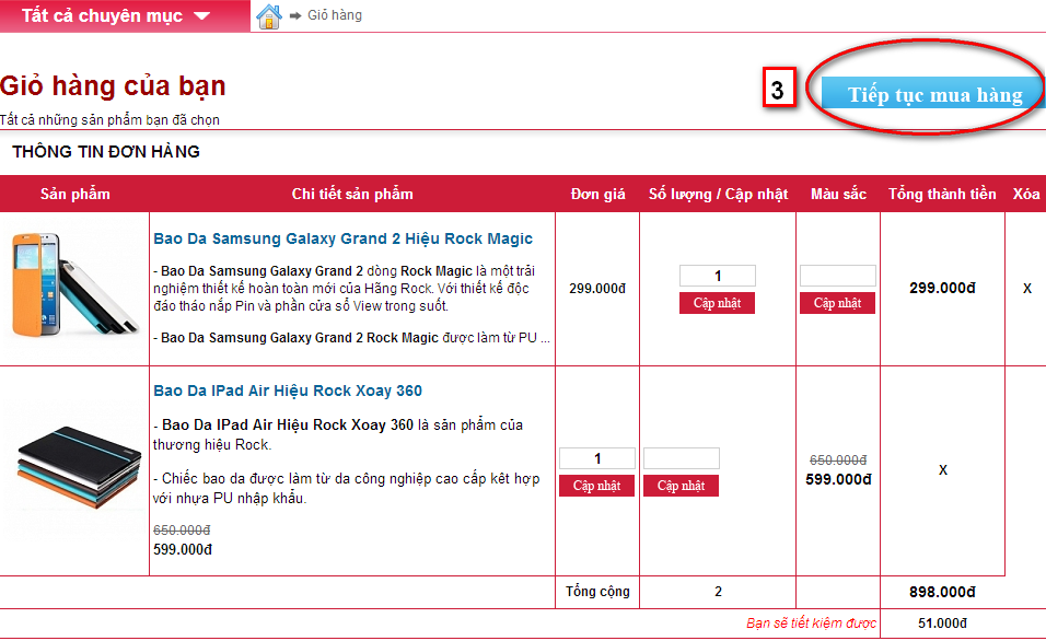 (3) Sau khi bấm vào nút Mua Hàng, hệ thống website sẽ chuyển đến trang Giỏ Hàng. Tại trang giỏ hàng quý khách có quyền Tiếp tục mua hàng nếu muốn mua thêm sản phẩm. Để tiếp tục mua hàng quý khách bấm vào nút Tiếp Tục Mua Hàng (hình bên dưới).